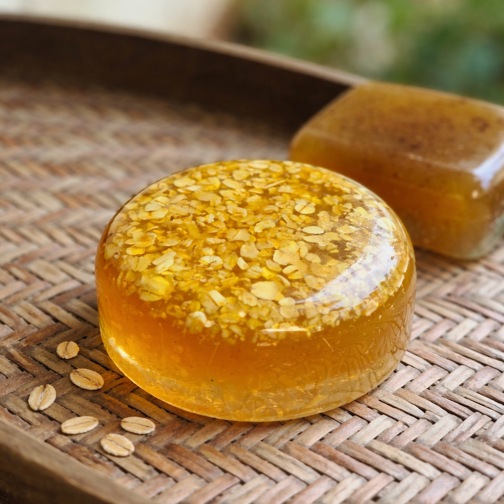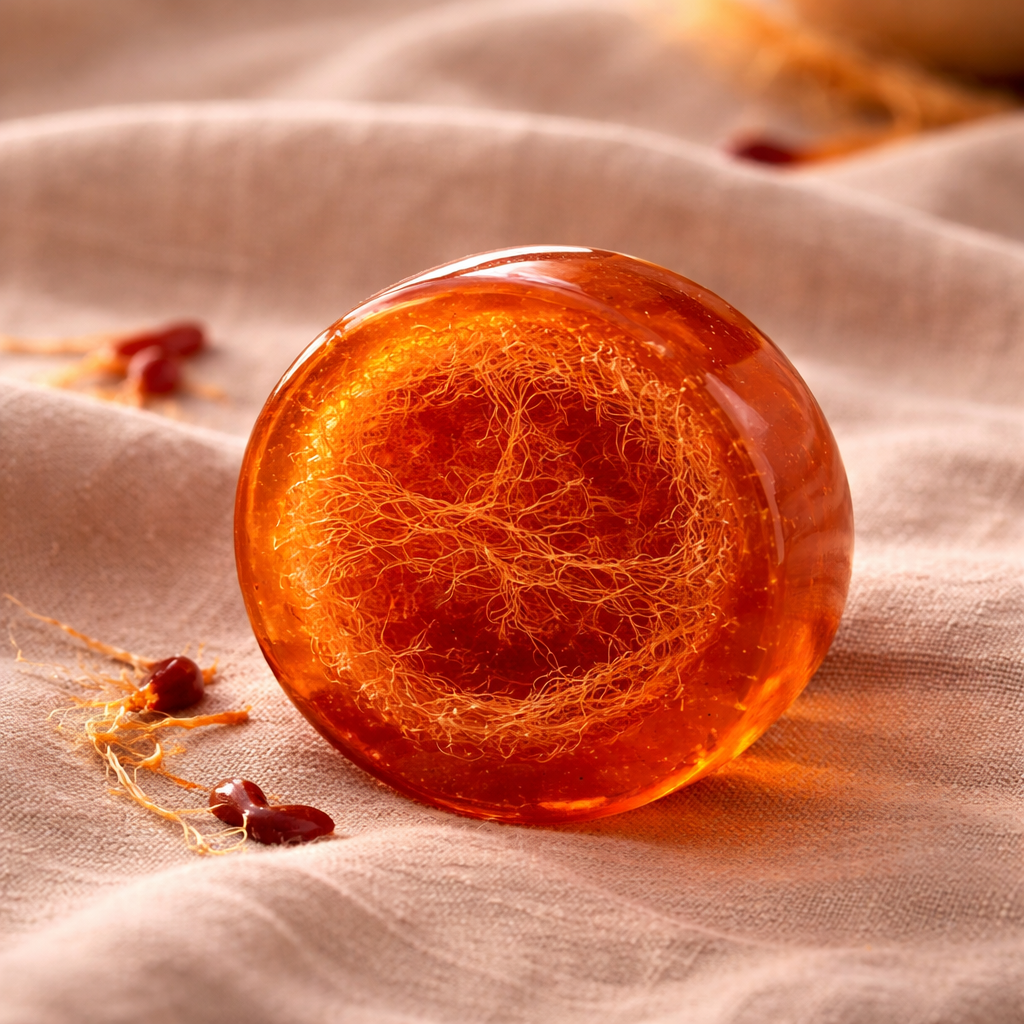 A 150g glycerin soap with a full slice of sun-dried loofah running through it. The loofah softens when wet and gently exfoliates, removing dead skin cells while the soap cleanses. A two-in-one bar that replaces your soap and scrub in one step.