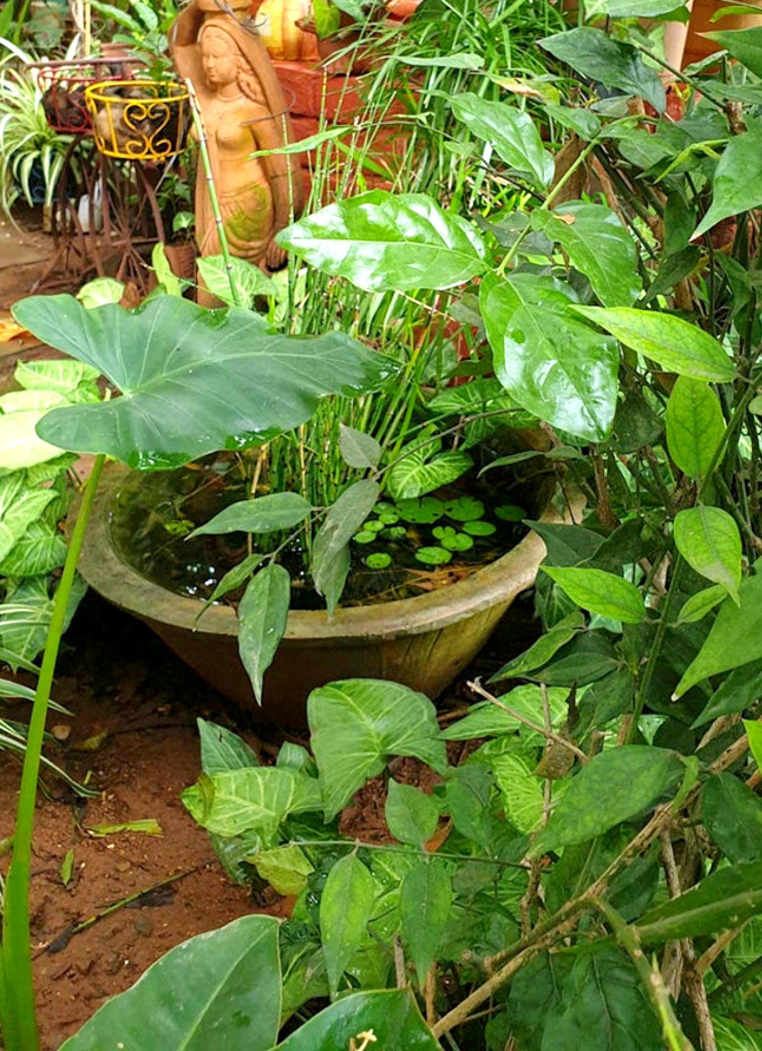 You can also make a pond in a container with some guppy fish and floating cabbage, as shown in the picture below